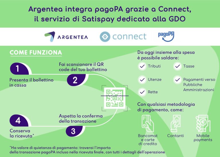 Argentea integra PagoPA grazie a Connect, il nuovo servizio sviluppato da Satispay dedicato alla GDO, che rende ancora più immediato e semplici il pagamento di bollettini